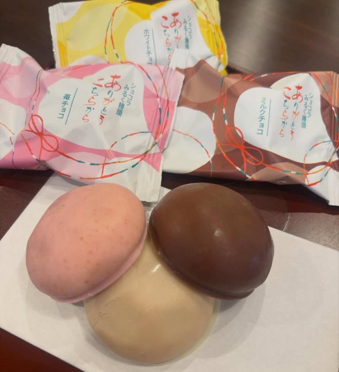 こちらは埼玉県から取り寄せましたショコラチョコ饅頭です。 2周年になるミルクとバターを使ったミルク風味の焼き菓子をチョコでコーティングしているお菓子になります。お味は、ミルク、ストロベリー、ホワイトの三種があります♪
