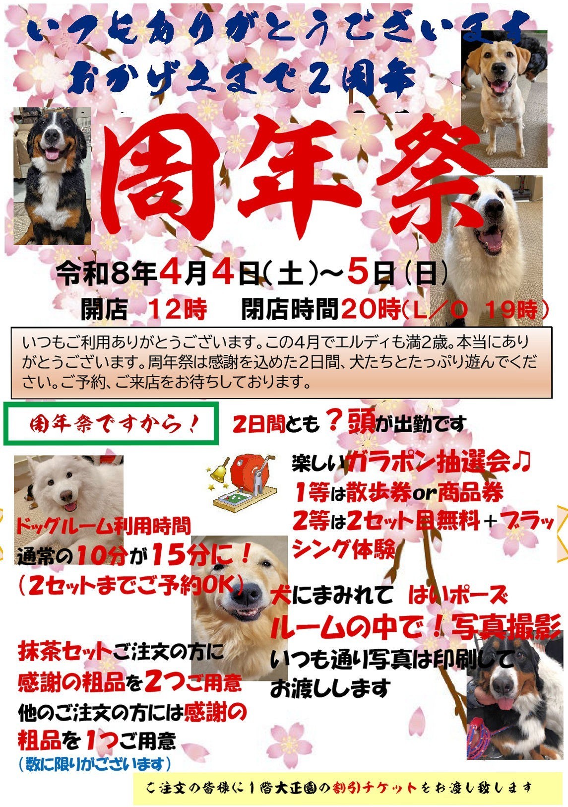 仙台名掛丁の大正園の2階にオープン致しました。美味しいお茶を楽しみながら、大型犬・超大型犬と遊ぶことも出来る癒しのお店です。